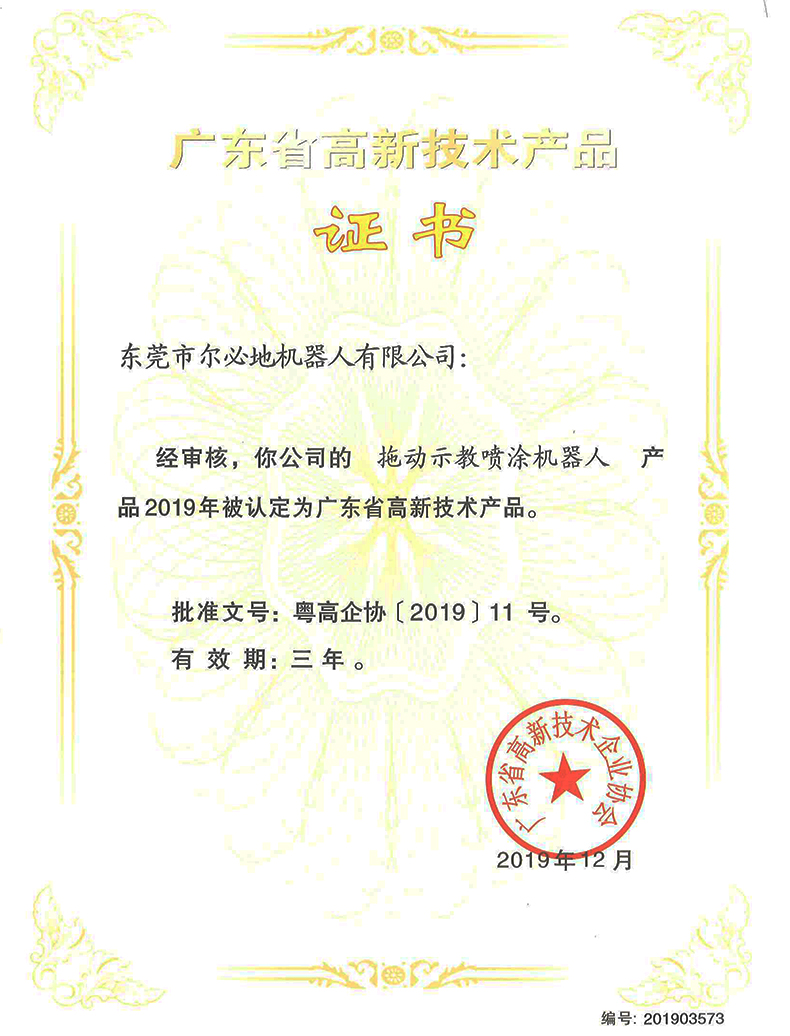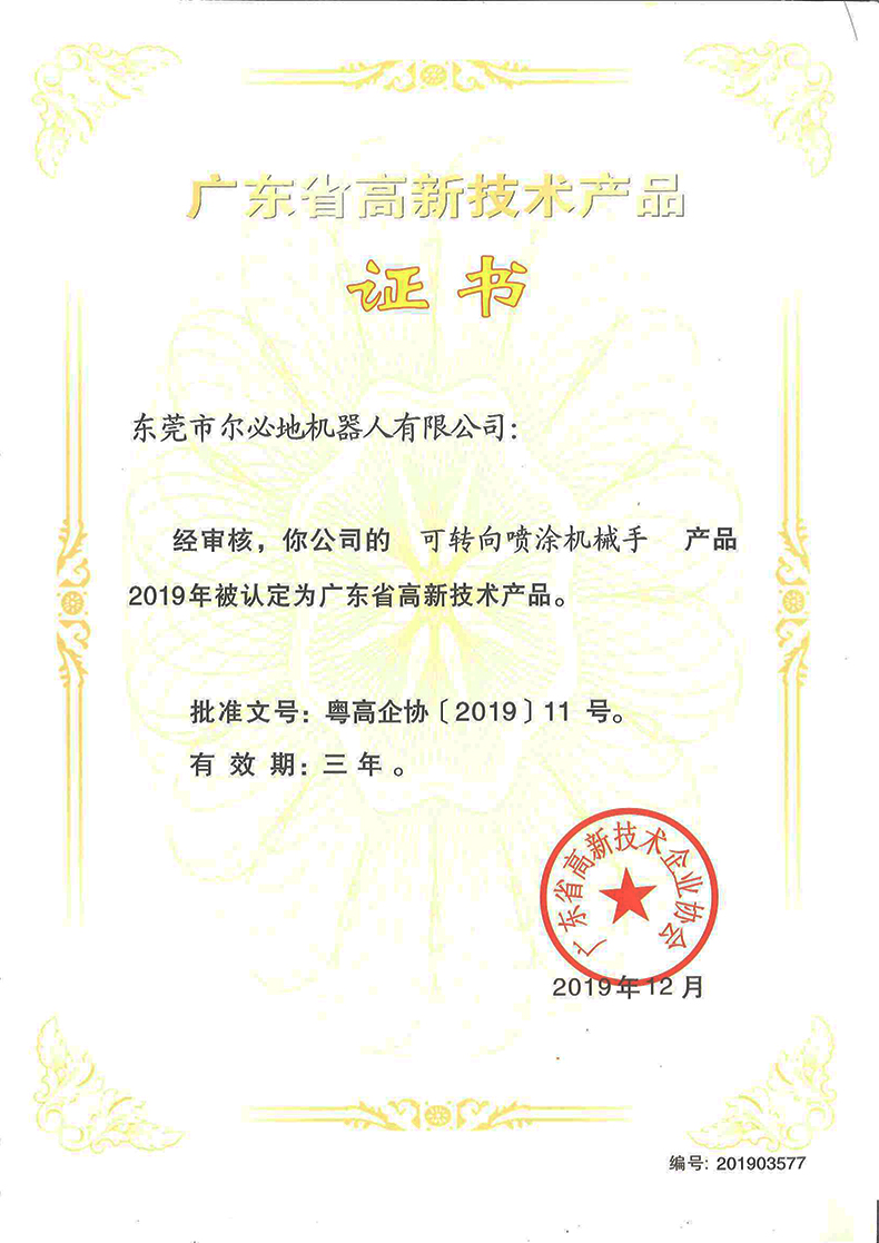 東莞市爾必地機(jī)器人有限公司在全體員工的共同努力下,經(jīng)過(guò)嚴(yán)格的層層審查,最終喜獲由廣東省高新技術(shù)企業(yè)協(xié)會(huì)頒發(fā)的《廣東省高新技術(shù)產(chǎn)品證書》,此次獲得高新技術(shù)產(chǎn)品認(rèn)定的產(chǎn)品有六個(gè),分別是“可轉(zhuǎn)向噴涂機(jī)械手”、“多關(guān)節(jié)防爆噴涂機(jī)器人”、“拖動(dòng)示教噴涂機(jī)器人”、“多關(guān)節(jié)碼垛機(jī)器人”、“多關(guān)節(jié)沖壓機(jī)器人”、“六軸噴涂機(jī)械手”。