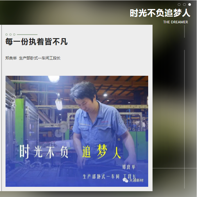 在這春和景明、萬物勃發(fā)的美好時(shí)節(jié),我們將以“大通新材”公眾號(hào)為載體,推出“時(shí)光不負(fù)追夢(mèng)人”系列故事,挖掘人物背后的故事,致敬每一個(gè)平凡而閃耀的追夢(mèng)者。本期我們對(duì)話臥式一車間的工段長鄭良舉,傾聽他散落在歲月長河里的追夢(mèng)故事。